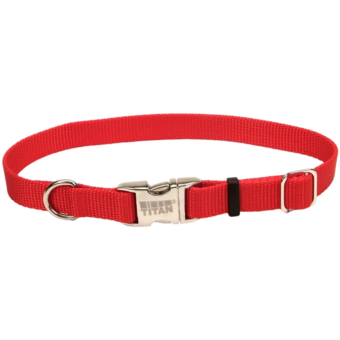 Featuring a contoured, lightweight, aluminum snap-lock buckle, the Coastal Pet Adjustable Nylon Dog Collar with Titan Metal Buckle Offers strength, durability and style. It is made from high-quality, durable nylon that is designed to prevent fraying. The Titan buckle makes this collar perfect for use with tie outs. Style: 61901.