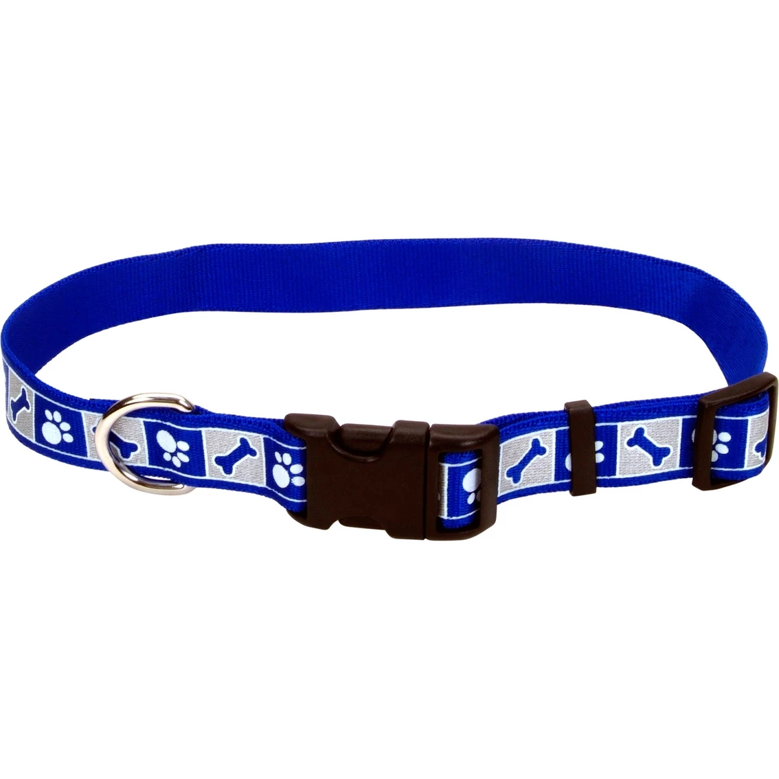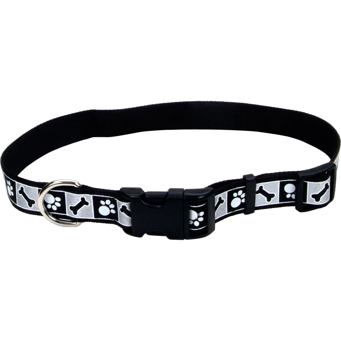 Help protect your pet at night with this stylish reflective collar. Featuring a fun, reflective paws and bones design on a solid-color nylon base, this collar reflects oncoming light for extra visibility and safety. Designed to accommodate a variety of medium to large breed dogs, this 1 in. collar easily adjusts in size from 18 in. up to 26 in. in length. Manufactured with soft, high quality nylon, this collar has a curved, snap-lock buckle which provides added comfort for the pet and convenience for the owner. Not recommended for use as a tie out collar.