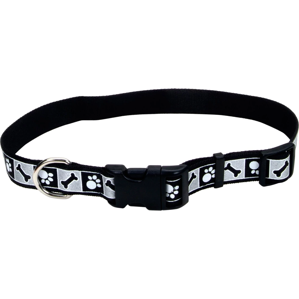Help protect your pet at night with this stylish reflective collar. Featuring a fun, reflective paws and bones design on a solid-color nylon base, this collar reflects oncoming light for extra visibility and safety. Designed to accommodate a variety of small to medium breed dogs, this 5/8 in. collar easily adjusts in size from 12 in. up to 18 in. in length. Manufactured with soft, high quality nylon, this collar has a curved, snap-lock buckle which provides added comfort for the pet and convenience for the owner. Not recommended for use as a tie out collar.