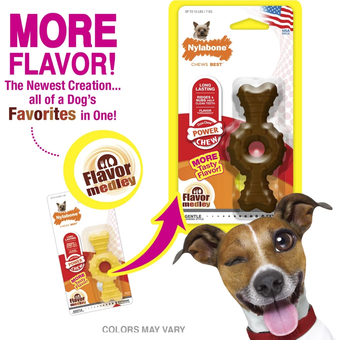 Powerful dogs need powerful chew toys! Made with tough, durable nylon and a textured surface for extra chewing fun, the Nylabone Dura Chew Power Chew Textured Bone is the long-lasting chew toy you need for aggressive chewers. The bristles raised during chewing promote clean teeth and fresh breath and help control plaque and tartar buildup. Your dog is sure to love the scrumptious flavor medley of this chew toy, too! Color may vary. Tough, durable nylon bone keeps powerful chewers busy. Nubs and ridges help clean teeth and fight plaque and tartar buildup.